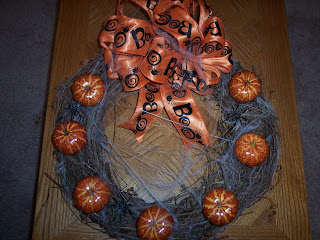 Red Writing. I got the idea for my wreath off of a picture she posted on her blog when she first announced the wreath party over a month ago. It was simple to make...just a bow, fake pumpkins, and a grapevine wreath. I made most of my wreath on our
